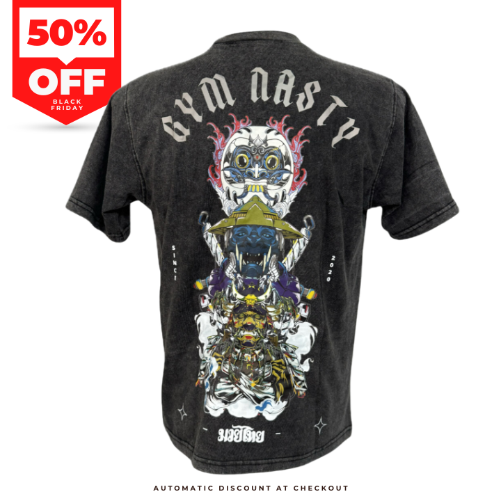 With our simple GYM NASTY branding on the front and our 3 warriors on the back, inspired by our travels in Thailand and love for Thai folklore.