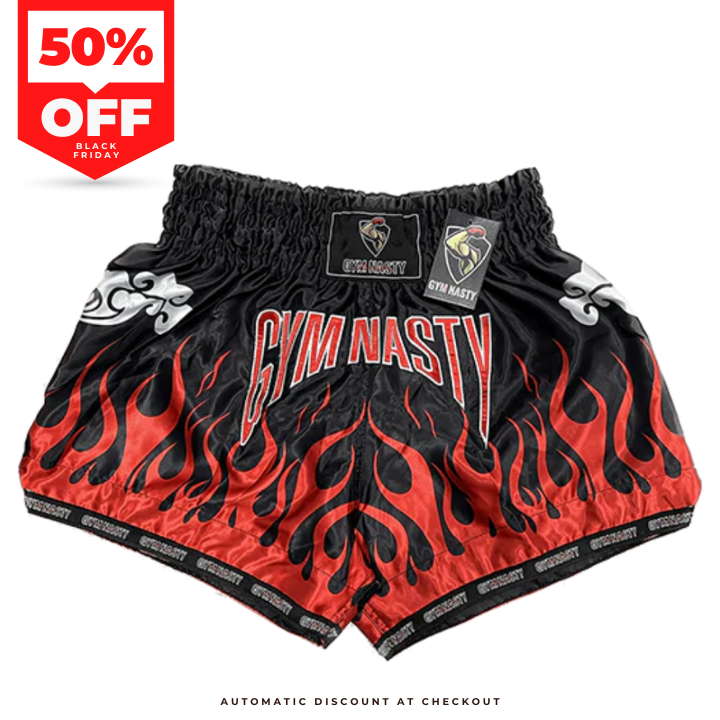 Classic black Muay Thai shorts with striking red flame patterns. Traditional Thai-inspired design meets modern UK sizing and quality construction.
