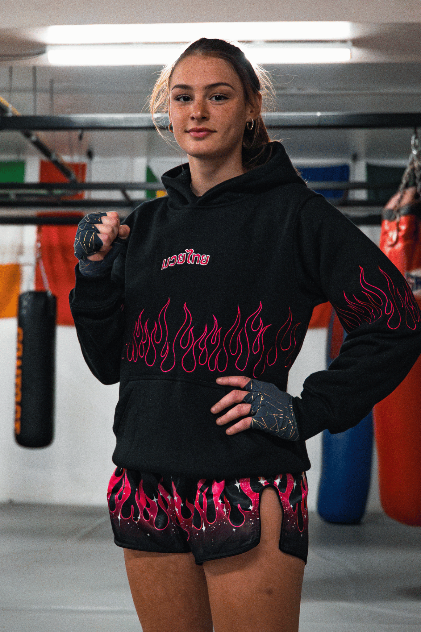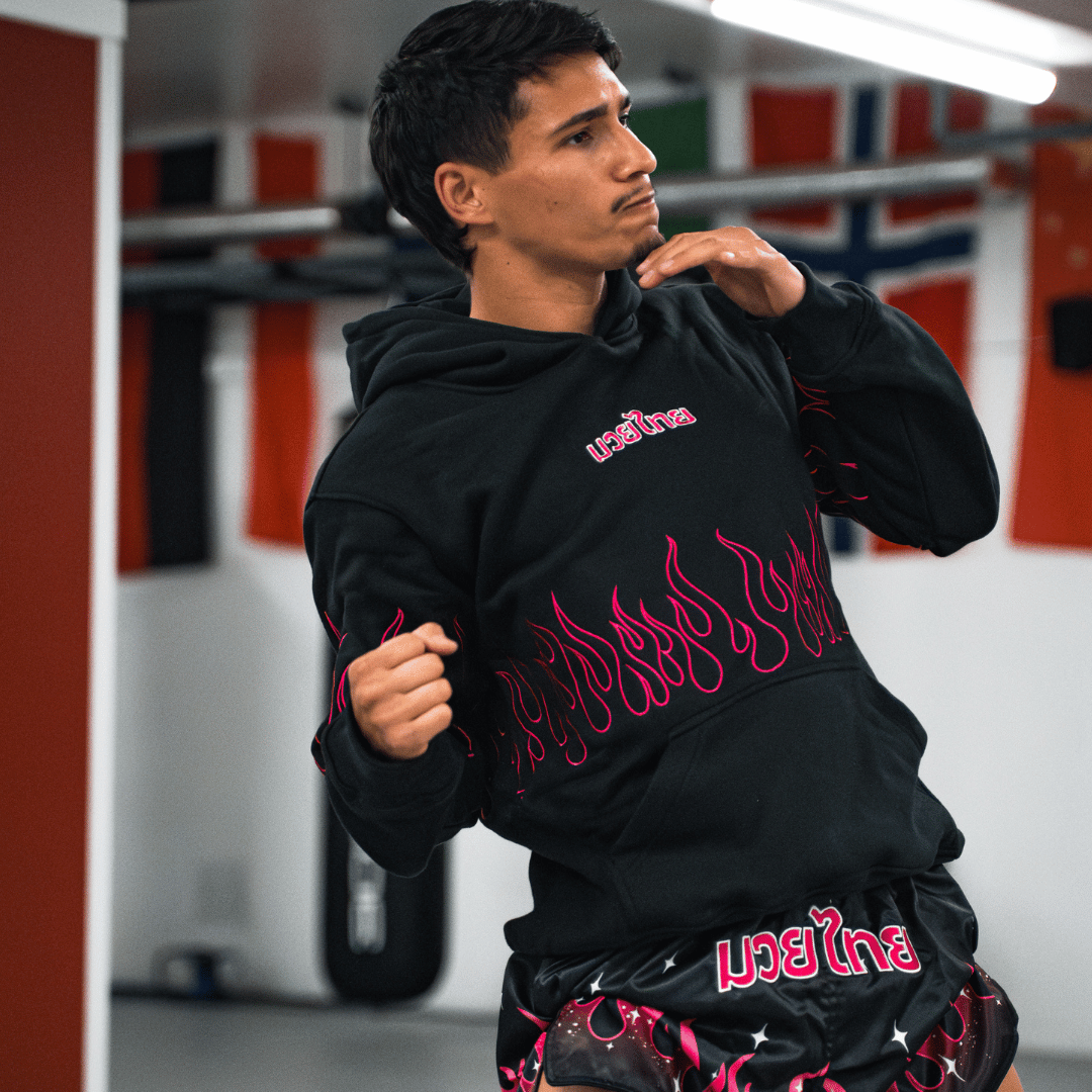 The bold pink flame design turns heads, while the Muay Thai (มวยไทย) Thai script pays tribute to the art of eight limbs. Whether you're repping Muay Thai on the streets or keeping warm after training, this hoodie is made to last.