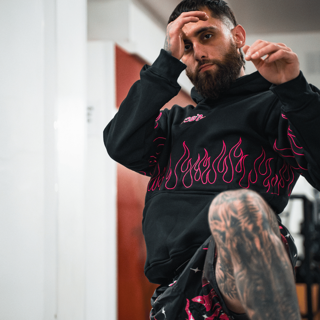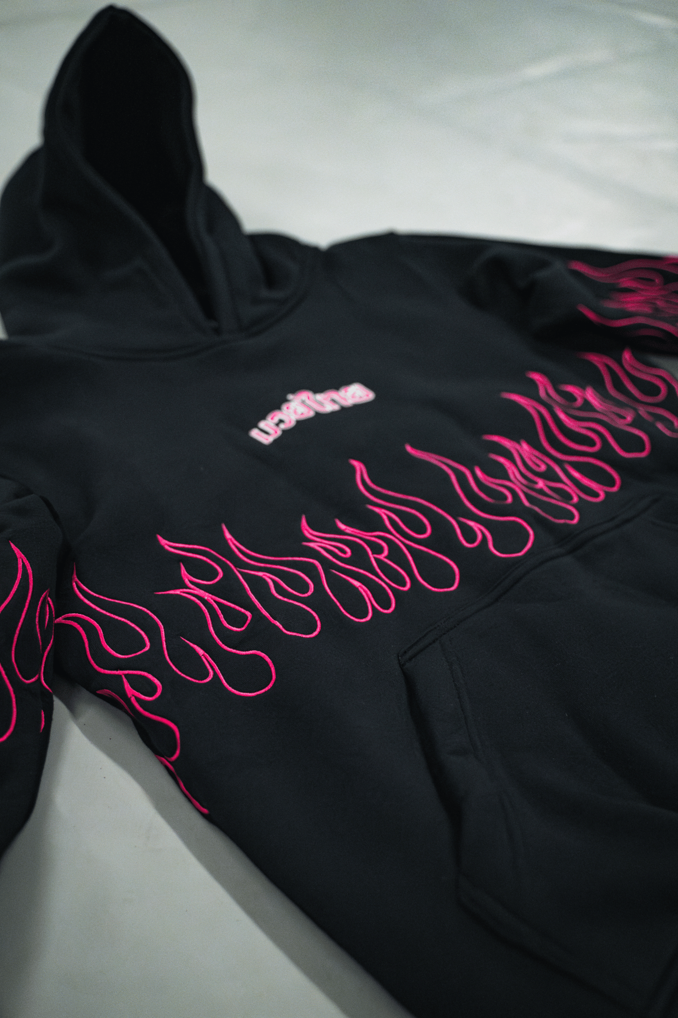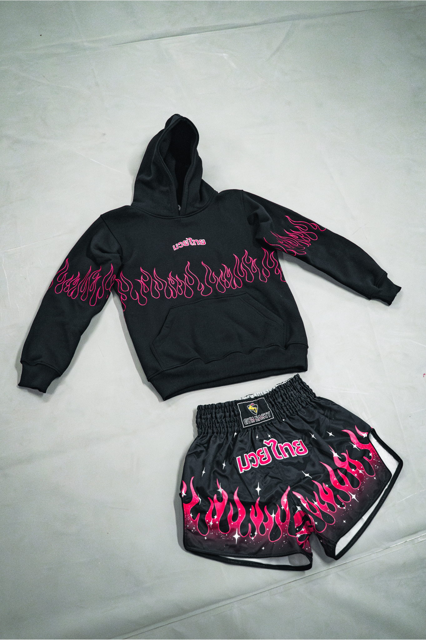 100% cotton pink flame Muay Thai hoodie. 350GSM.